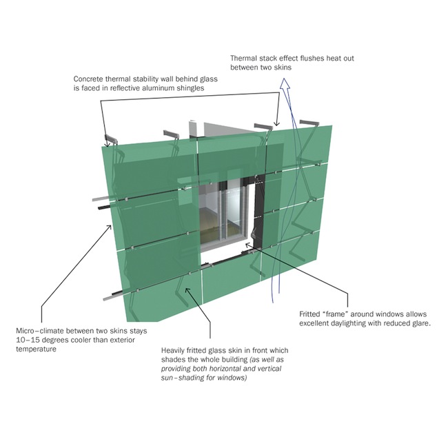 The outer layer comprises an almost opaque green glass, which is placed away from the actual thermal wall of the building, shades the structure substantially from direct heat gain from the hot Texas sun.