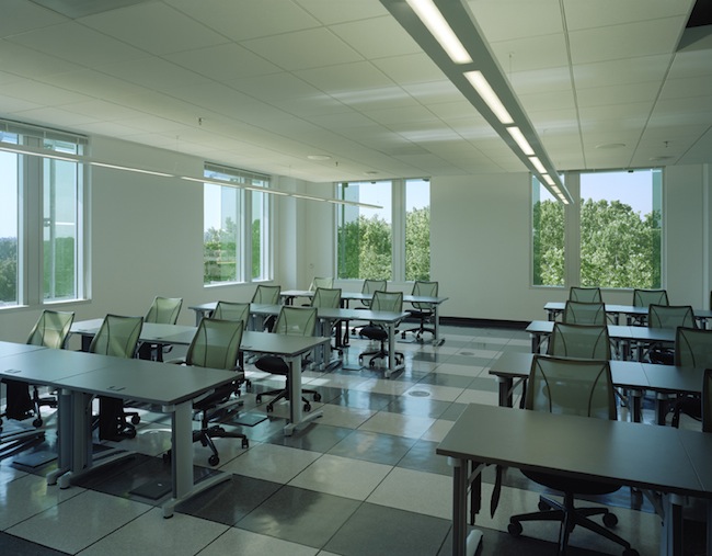 As light filters through the green glass it creates a beautiful natural light “fixture.This is supported by very consistent rhythm of suspended linear fixtures over all open work spaces.